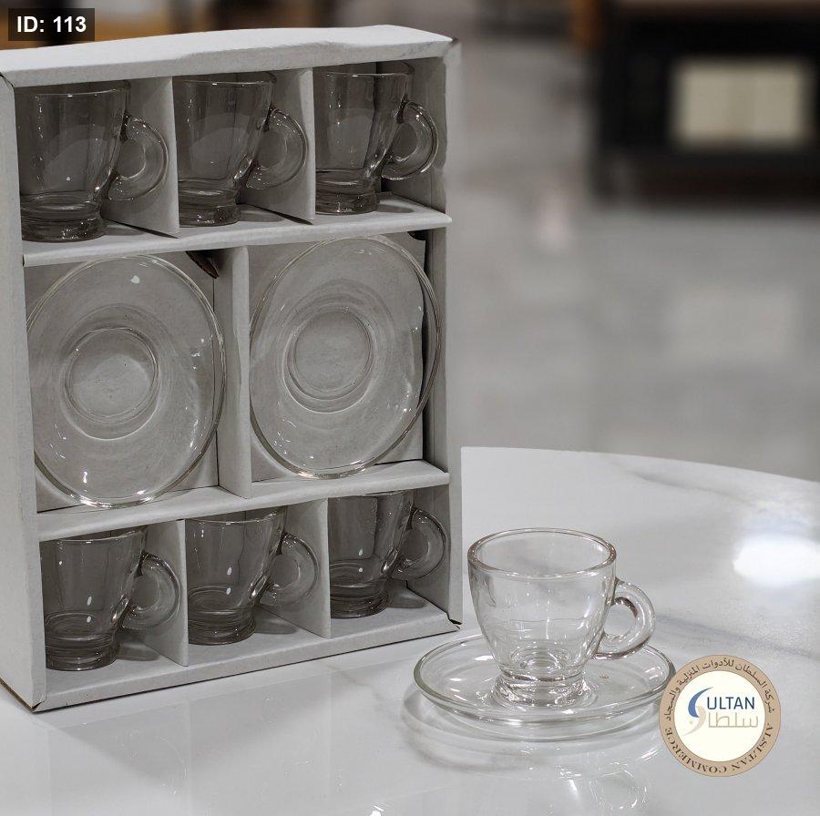 طقم 6 فناجين قهوة + 6 صحون زجاج شفاف مع حز ذهبي