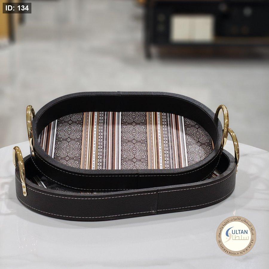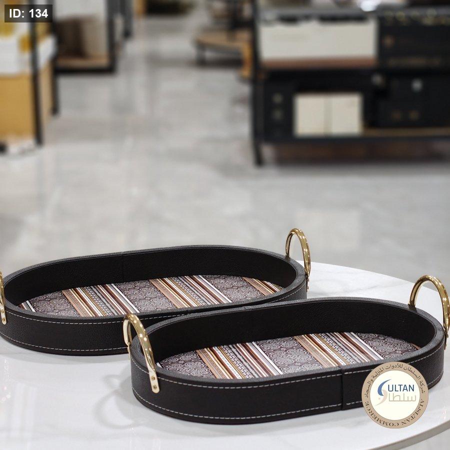 طقم صواني جلد بيضاوي مكون من حجمين مع مقبض معدني