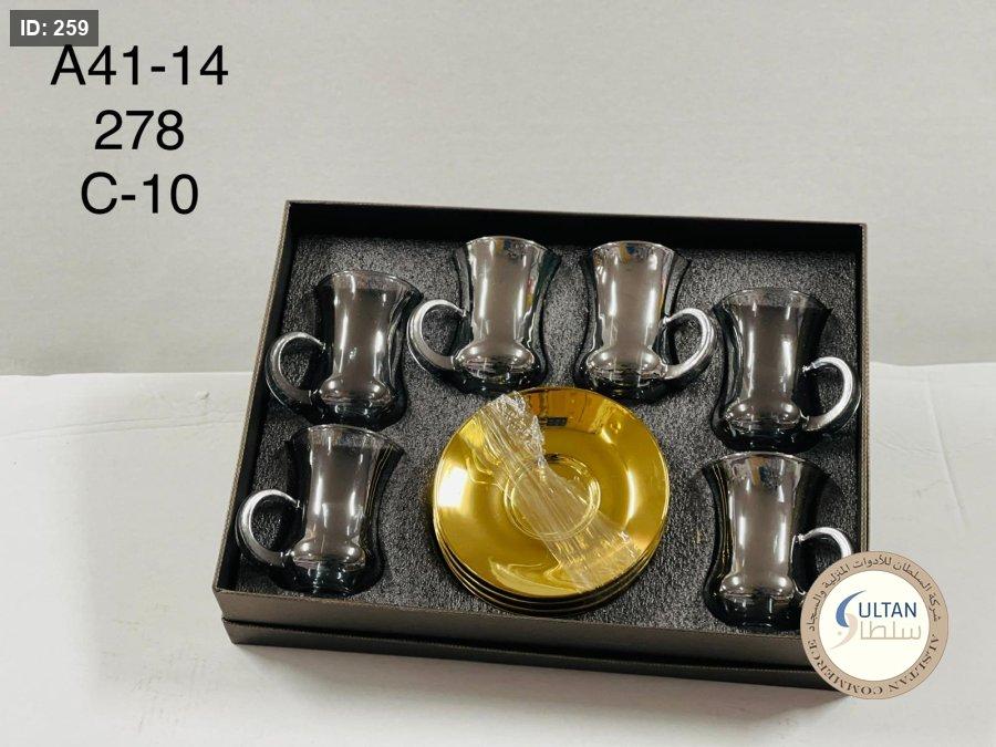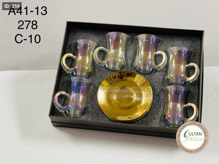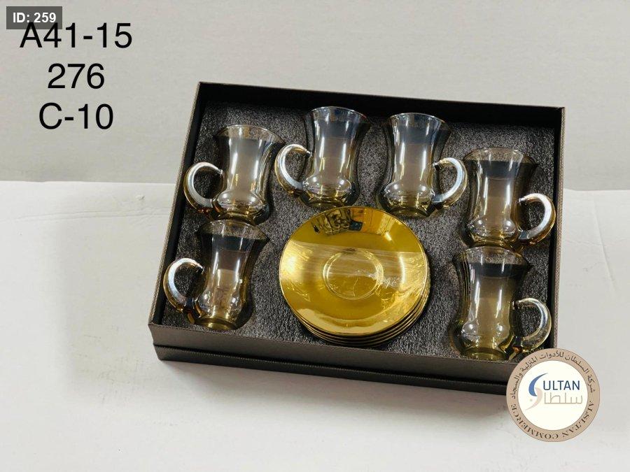6 كاسات شاي + 6 صحون زجاج ذهبية