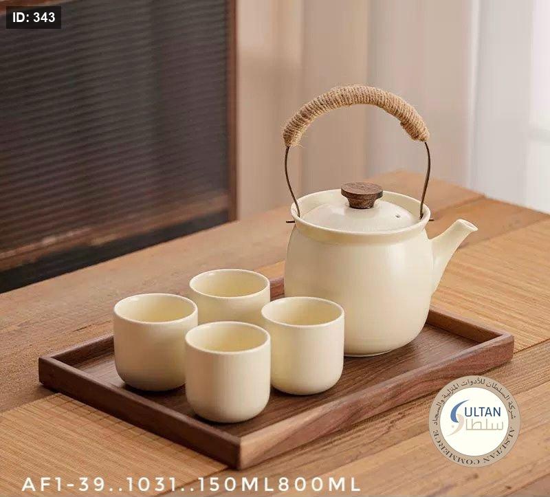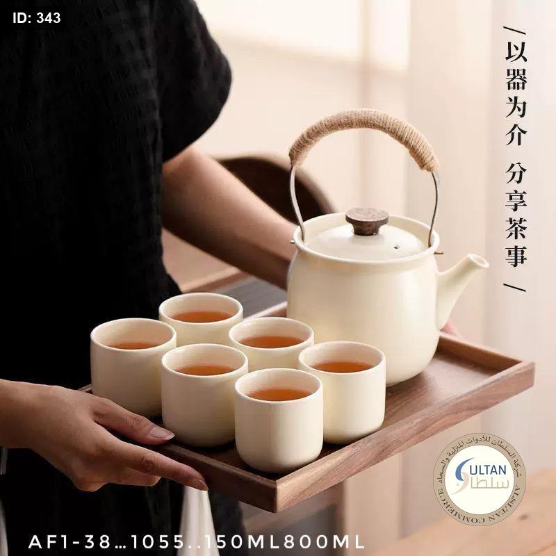 مكون من 8 قطع, 6 فناجين شاي + ابريق + صينية خشب الجوز