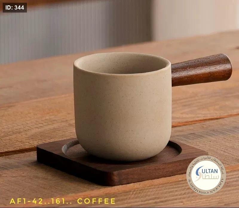 فنجان سيراميك بمقبض خشبي وصحن خشب الجوز