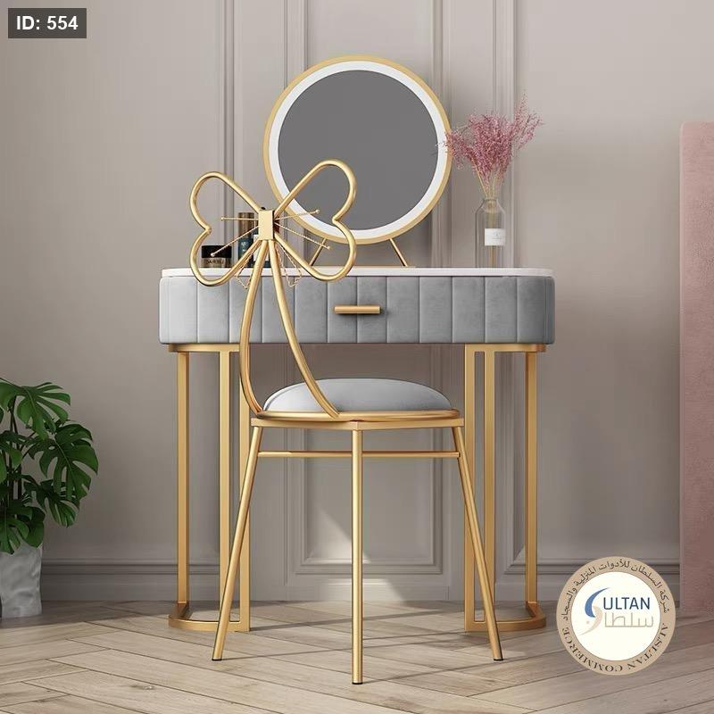 تتكون المجموعة من طاولة مع درج ومرآة دائرية مضيئة وكرسي