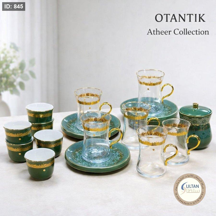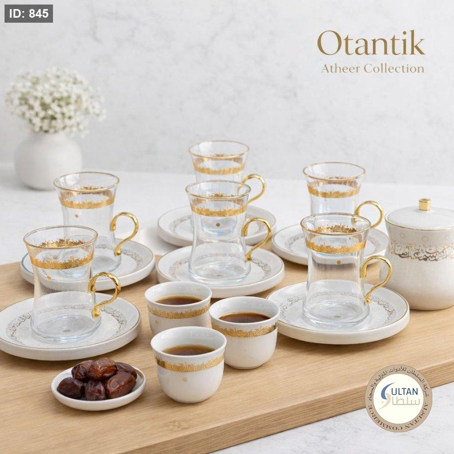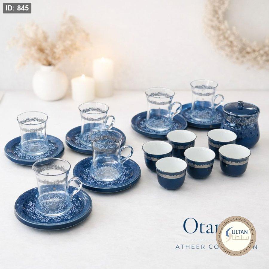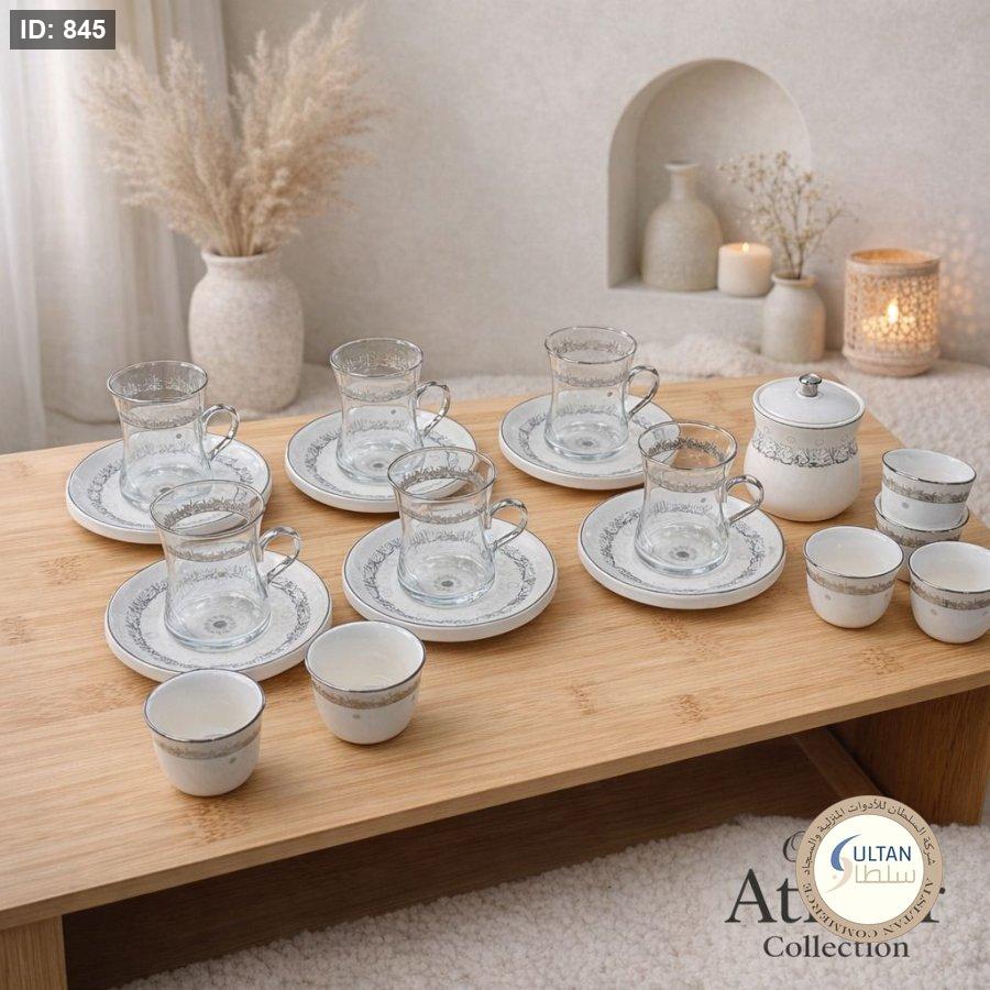 الطقم مكون من 6 استكانات شاي+6 صحون+ 6 فناجين قهوة سادة + سكرية